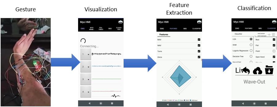 MyoHMI is an Android-based Neural-Machine Interface capable of recognizing a user's physical intent from surface EMG signals, useful for medical applications such as Stroke Rehabilitation and Amputees.